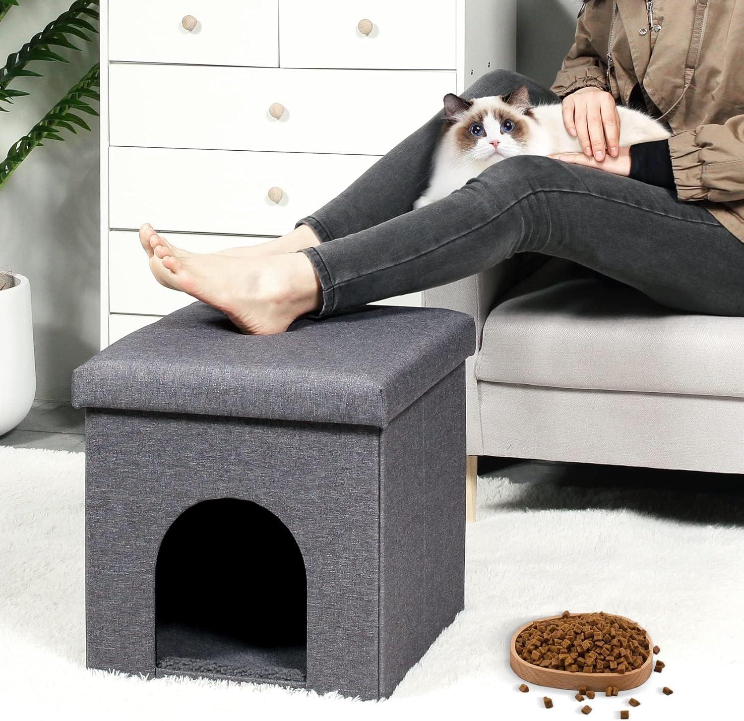 B FSOBEIIALEO Cat Ottoman House Cube for Indoor, Folding Cats Houses Condos Cat Cave, Foot Stool Padded Seat Linen Grey 15.7″