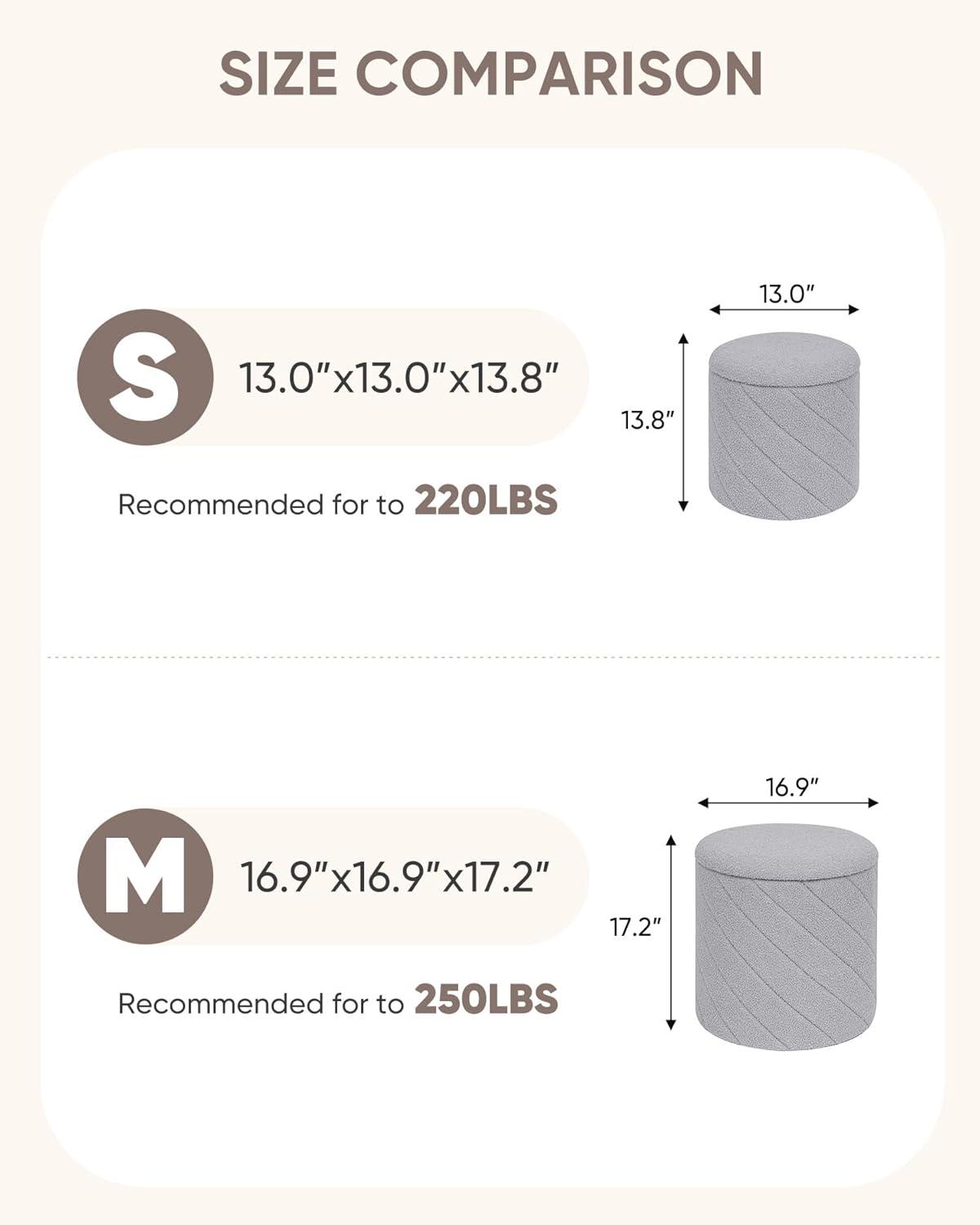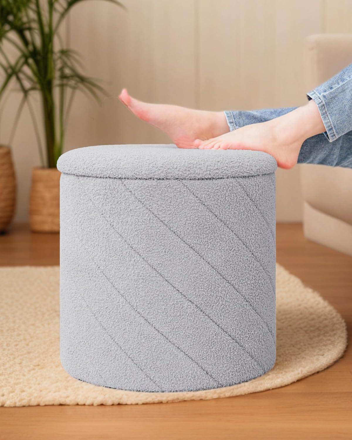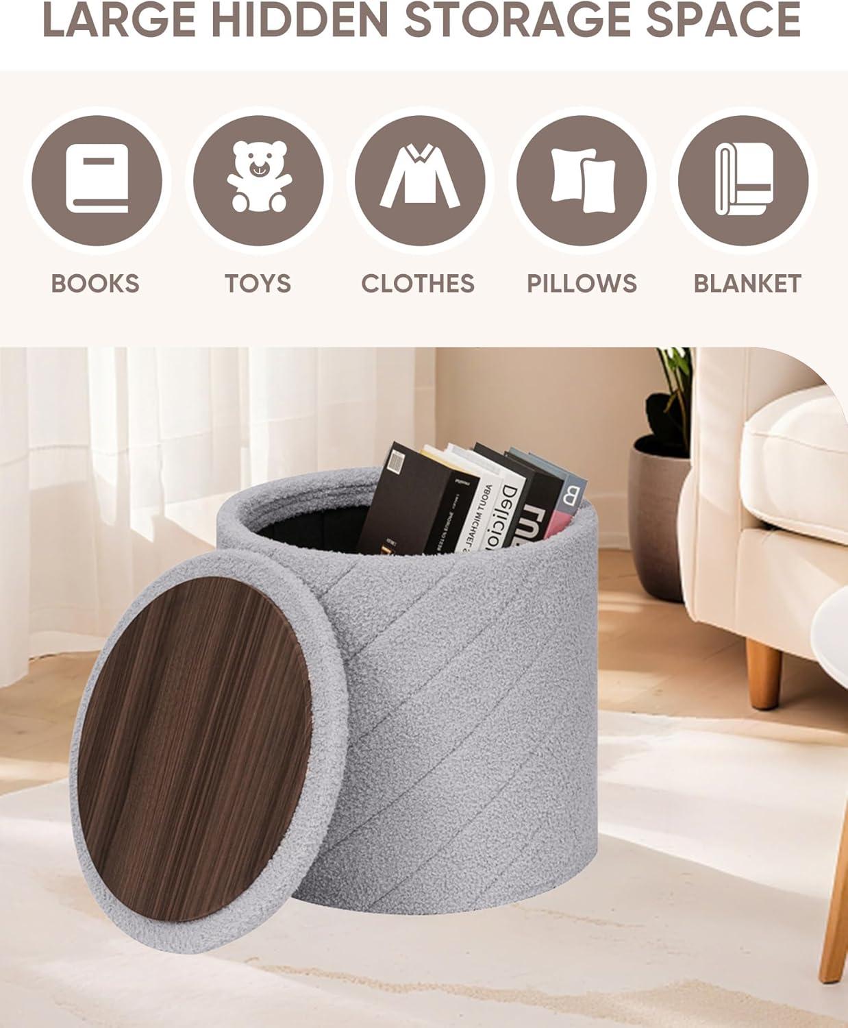 B FSOBEIIALEO Ottoman with Stroage, Boucle Round Storage Ottoman with Tray, Foot Rest Stool for Dorm Room, Living Room White, 16.93″x16.93″x17.72″(Grey)