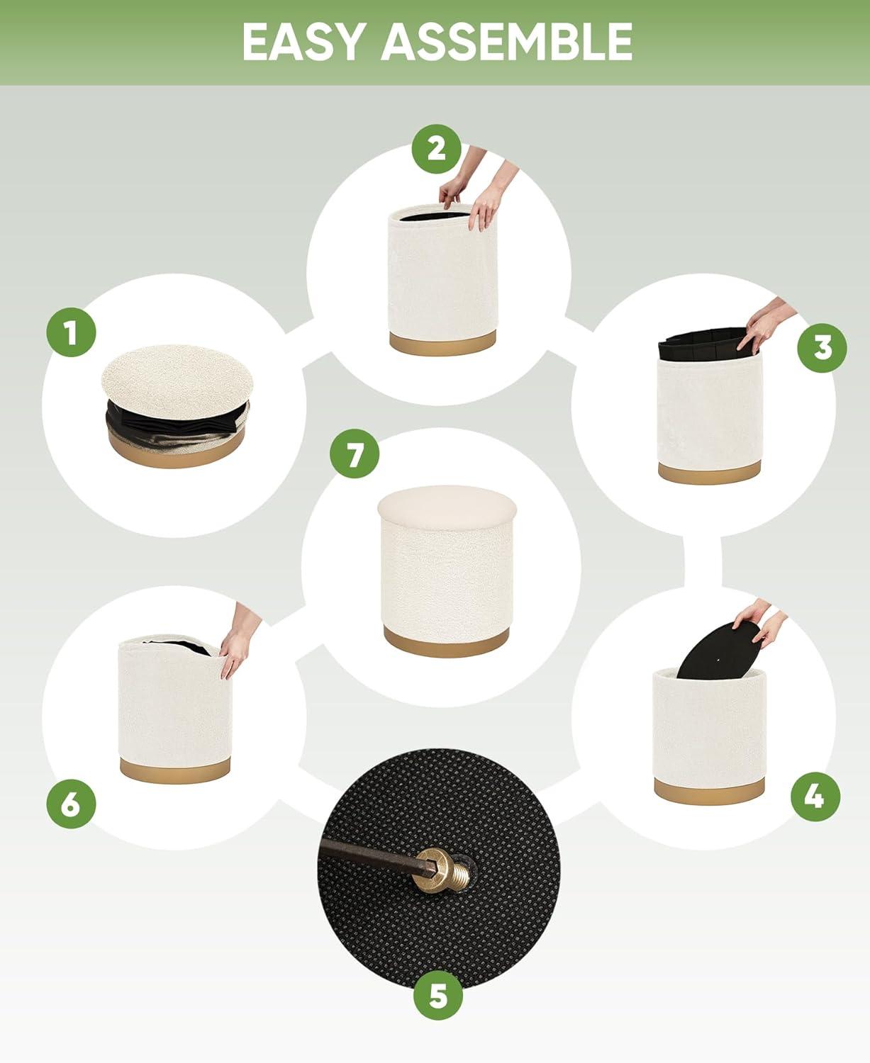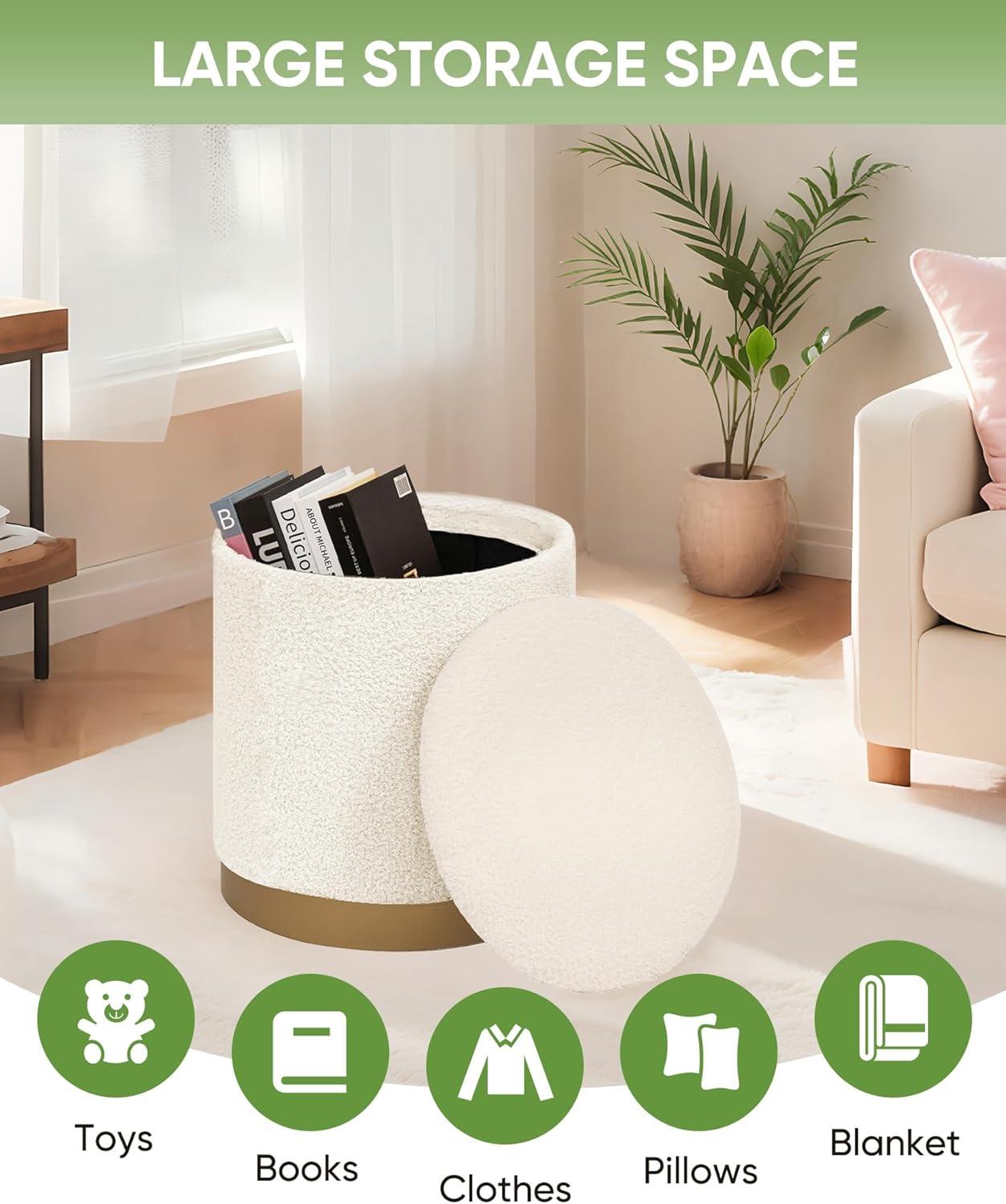 B FSOBEIIALEO Ottoman with Stroage, Round Boucle Storage Ottoman with Gold Plating Base,Foot Rest Stool for Dorm Room, Living Room Black, 14.76″x14.76″x16.34″(White)
