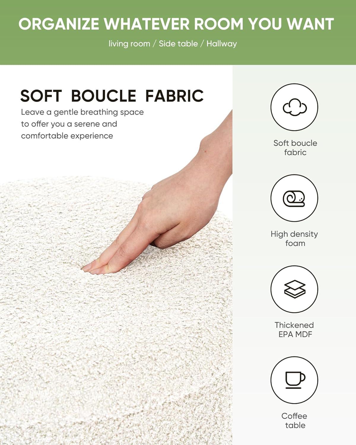 Product Description: Brand Name: B FSOEBIIALEO Material: Boucle with MDF board Size:14.76L x 14.76W x 16.34H inches Package Weight: 8.3lbs/3.75kgs Care Guide: Spot clean with a damp cloth or sponge; blot to remove excess water. Air dry. Notes: Children are forbidden to climb or play on the stools to avoid tipping over and causing injury. Be careful if you need to stand on a footstool or use it as a ladder or climbing tool.