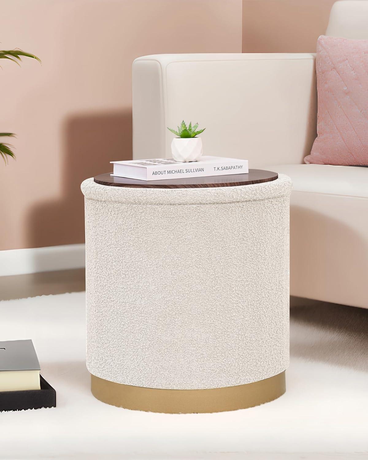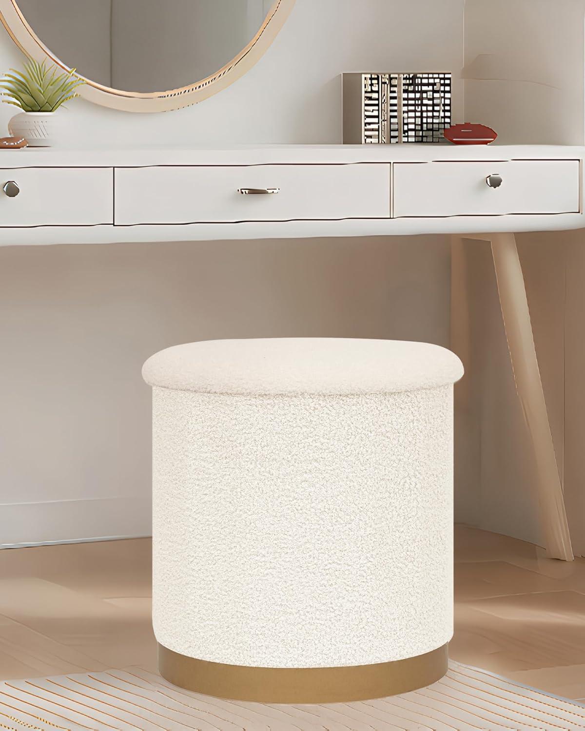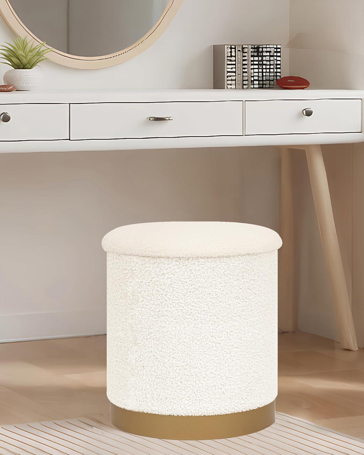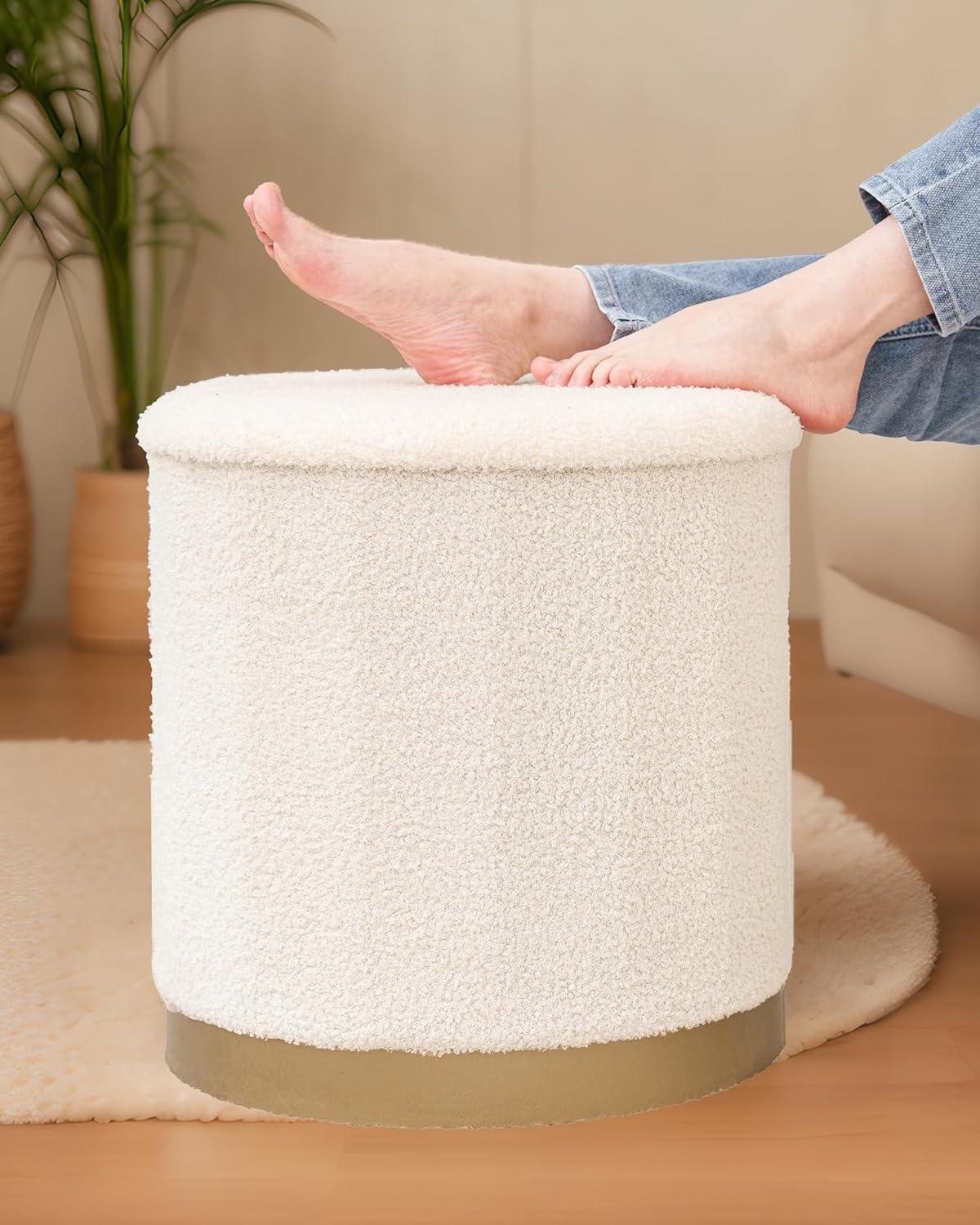 B FSOBEIIALEO Ottoman with Stroage, Round Boucle Storage Ottoman with Gold Plating Base,Foot Rest Stool for Dorm Room, Living Room Black, 16.73″x16.73″x17.72″(White)
