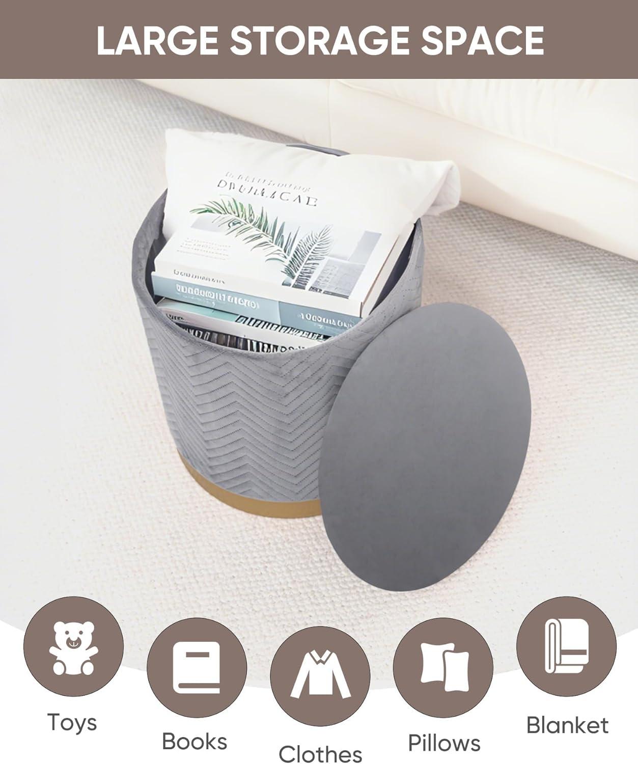 B FSOBEIIALEO Ottoman with Stroage, Round Velvet Storage Ottoman with Gold Plating Base,Foot Rest Stool for Dorm Room, Living Room White, 14.76″x14.76″x16.36″(Grey)